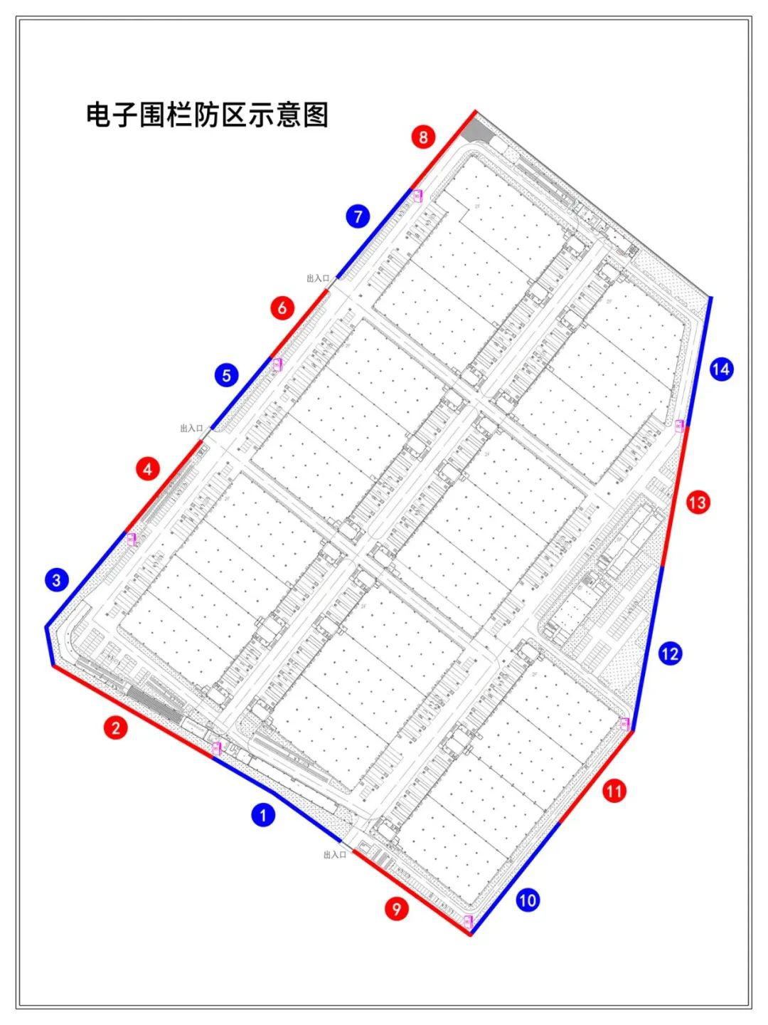 3、按照脈沖圍欄國家標(biāo)準(zhǔn)GB7946-2015規(guī)定單個(gè)防區(qū)不能超過100米,項(xiàng)目上我們設(shè)計(jì)為14個(gè)防區(qū)。